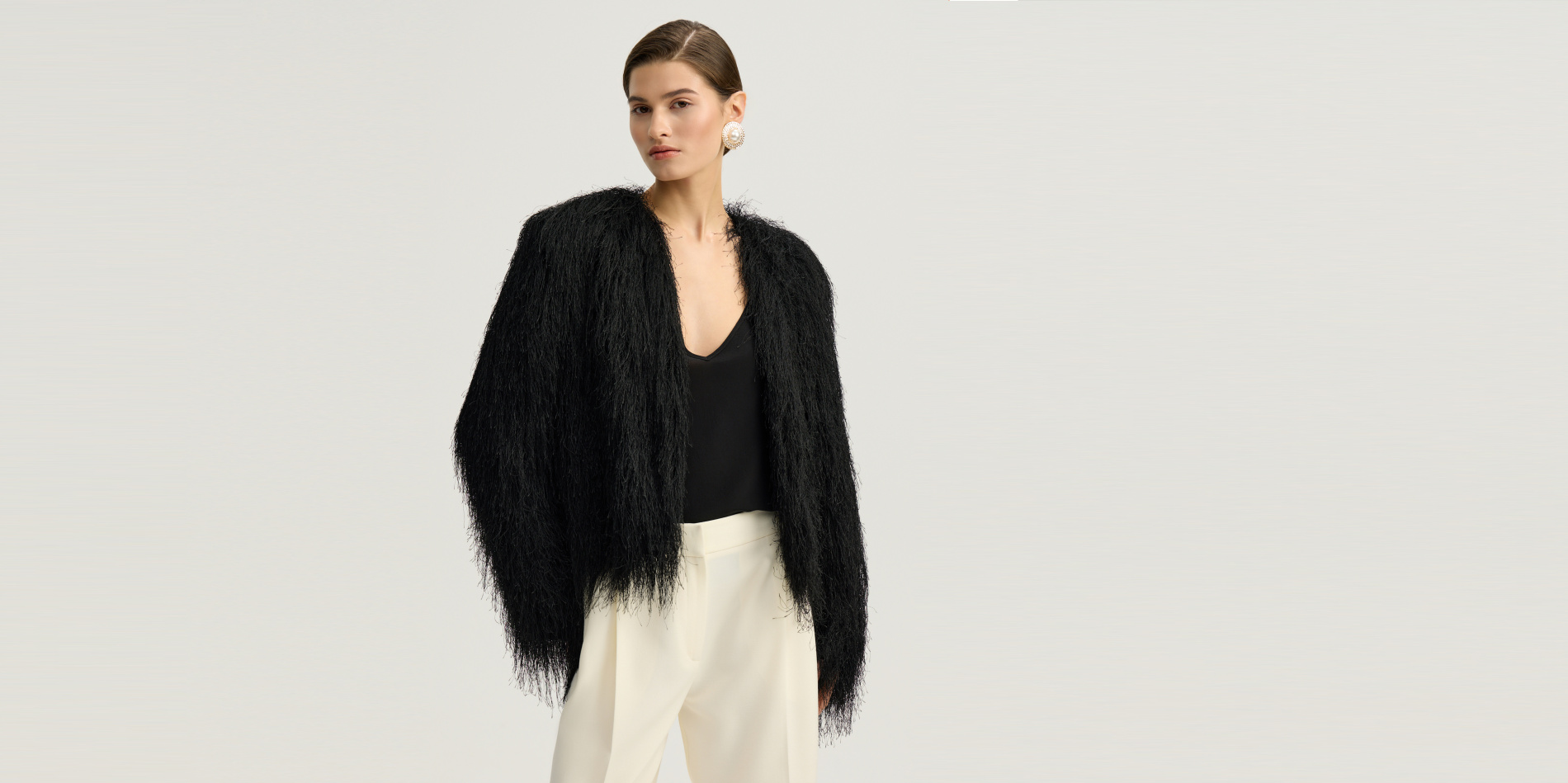 Каждый образ из новогодней коллекции про уникальность и внимание к себе. Она так и называется «в свете софитов», а одежда только усиливает ваше сияние, несмотря на выдержанную палитру.